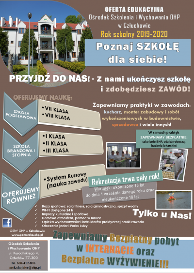 W związku z nowym naborem uczniów do Ochotniczych Hufców Pracy w Człuchowie, tj. Ośrodka Szkolenia i Wychowania pragniemy przedstawić Państwu ofertę dla młodzieży w wieku 15-18 lat, która nie ukończyła szkoły podstawowej albo nie kontynuuje nauki po jej ukończeniu, pomagamy uzupełnić wykształcenie podstawowe i ponadpodstawowe oraz zdobyć kwalifikacje zawodowe.